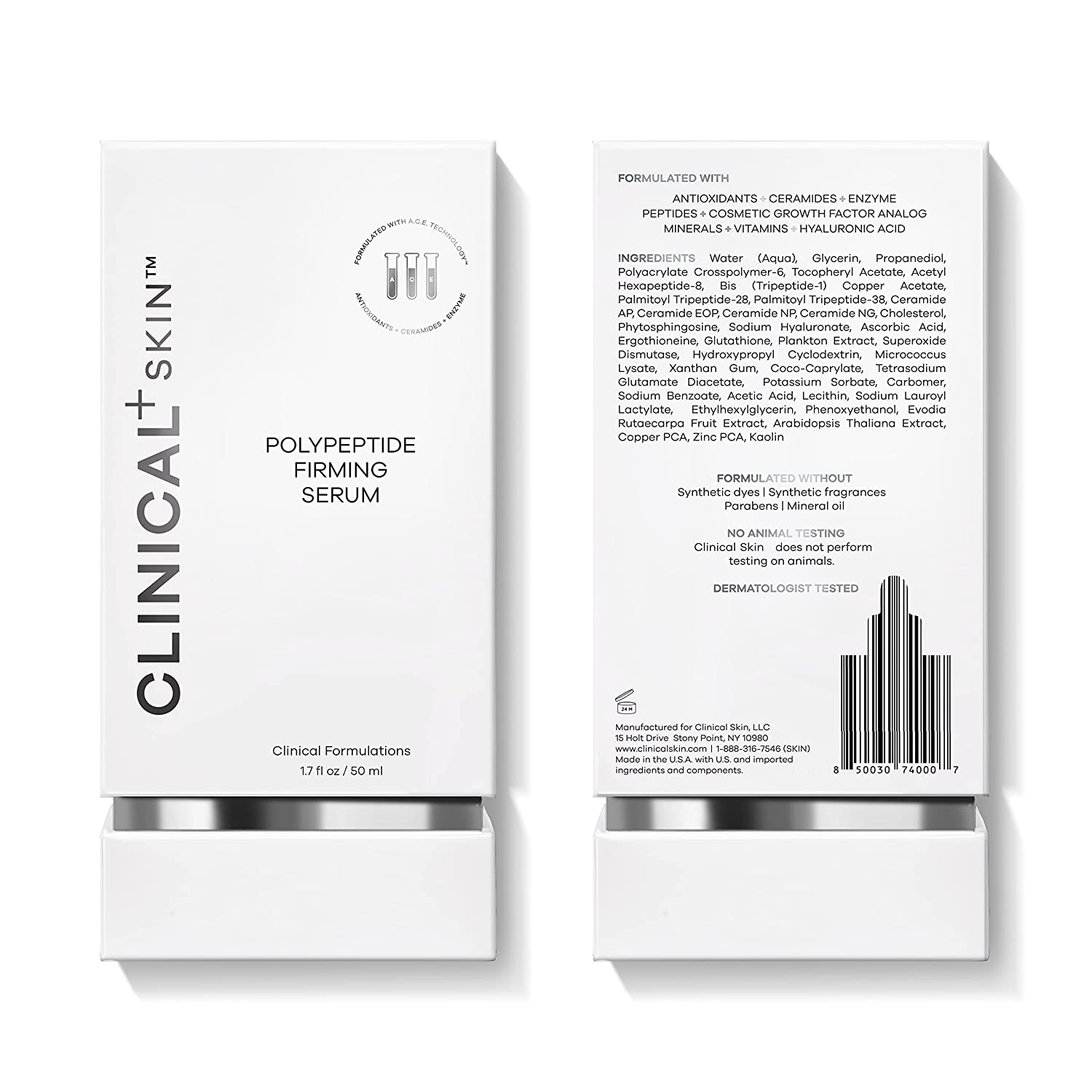 • QUALITY INGREDIENTS: Clinical Skin uses only the best ingredients for its formulas. This blend includes peptides, cosmetic growth factor analog, hyaluronic acid, antioxidants, ceramides, enzymes, vitamins and minerals. Our products are not tested on animals.